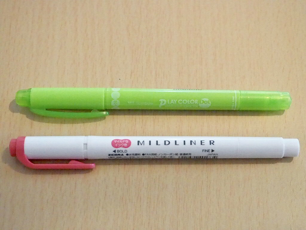トンボさんが出している「プレイカラードット」とゼブラさんが出している「マイルドライナー」です。